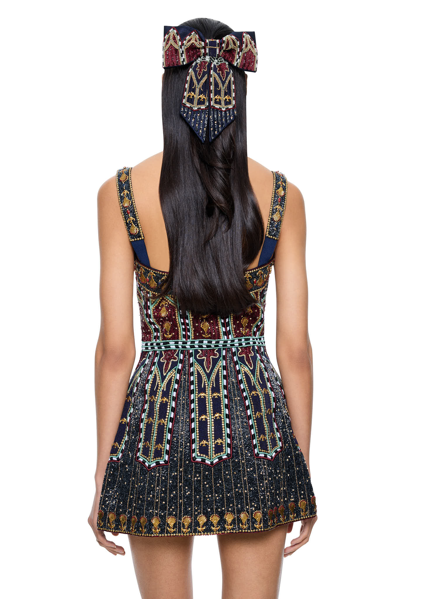 Crafted as the perfect compliment to our Joan of Arc Mini Dress, this Christmas Limited Edition Bow channels the same spirit of feminine resilience and medieval grandeur. Each bow is meticulously hand-beaded with glass beads in rich burgundy and midnight tones with shimmering accents.