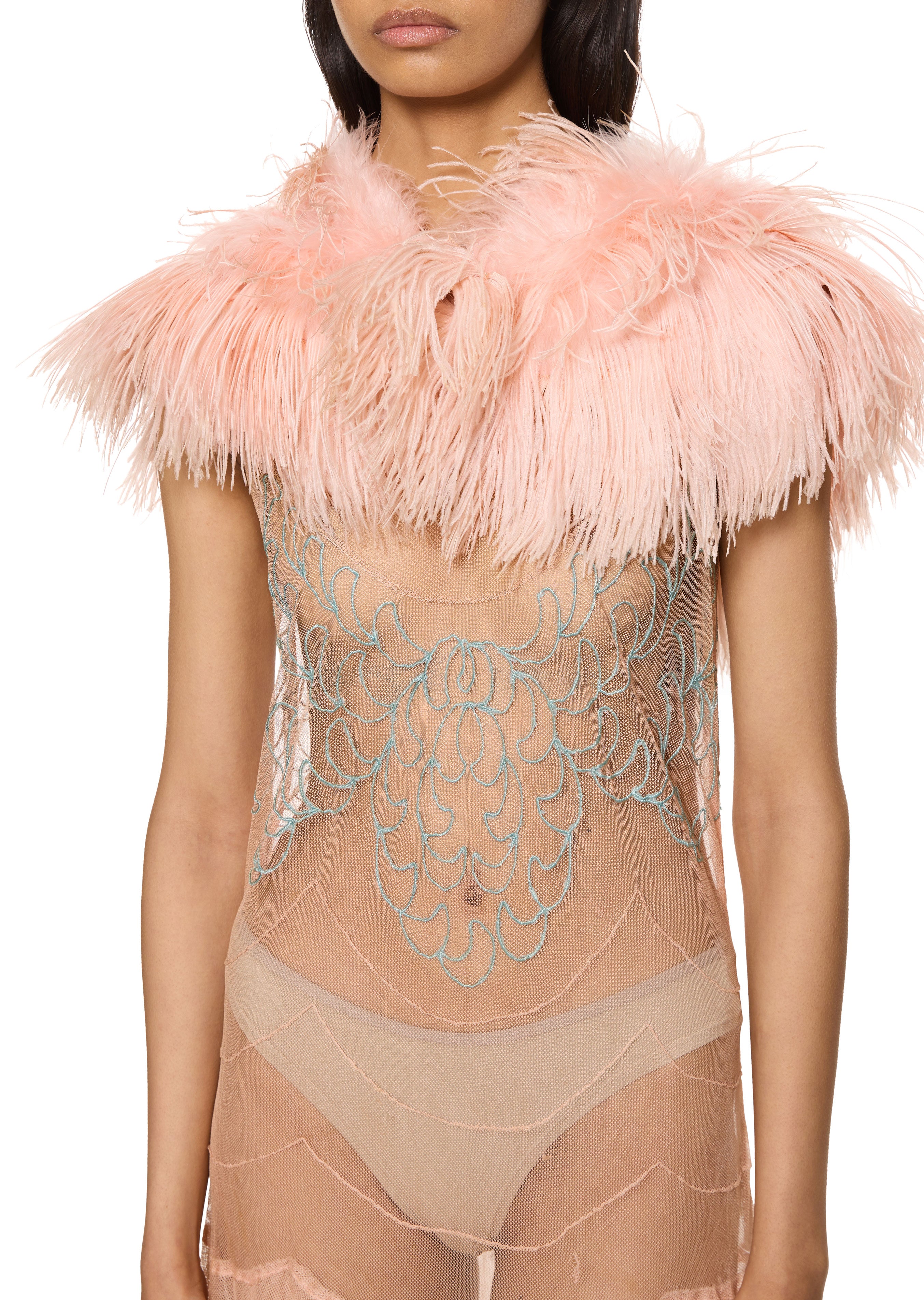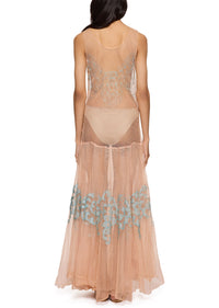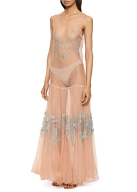 Step into the elegance of the 1920s with this breathtaking light Peach tulle gown. This ethereal piece features exquisite Blue hand-embroidered details that gracefully adorn the delicate fabric.