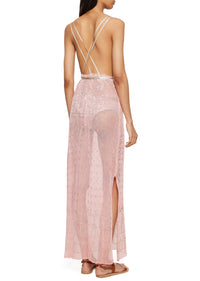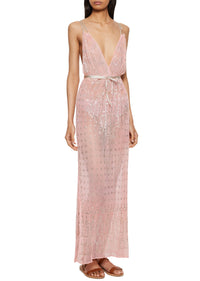 An original 1920's light pink sheer dress, featuring a plunging neckline that is then cinched at waist by a metallic lace tie. The delicate thin straps elegantly lead into an open back cross design.
