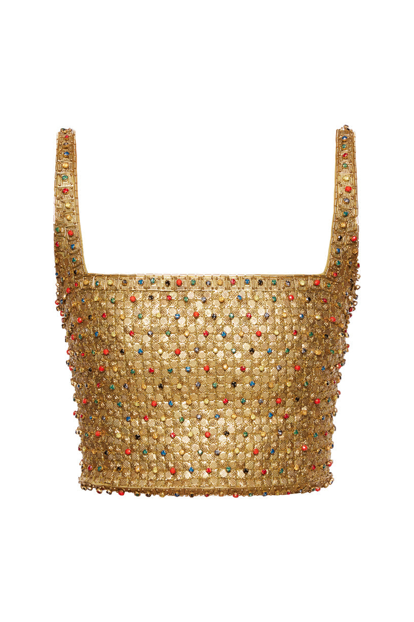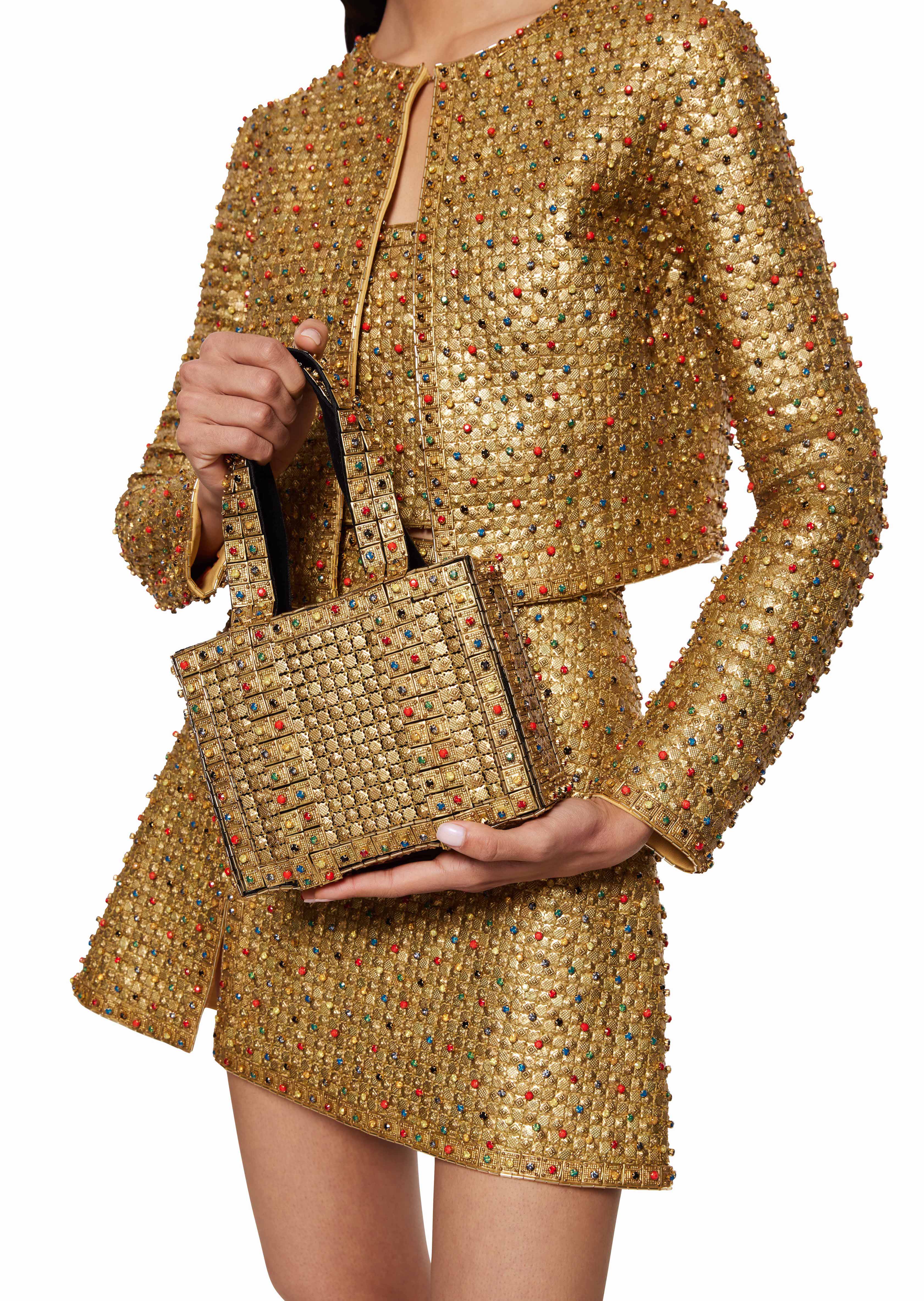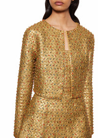 Discover the Achilles Cropped Jacket in Aurous, featuring a handmade metal mosaic base adorned with hand-embroidered coloured rhinestones for a truly striking effect.