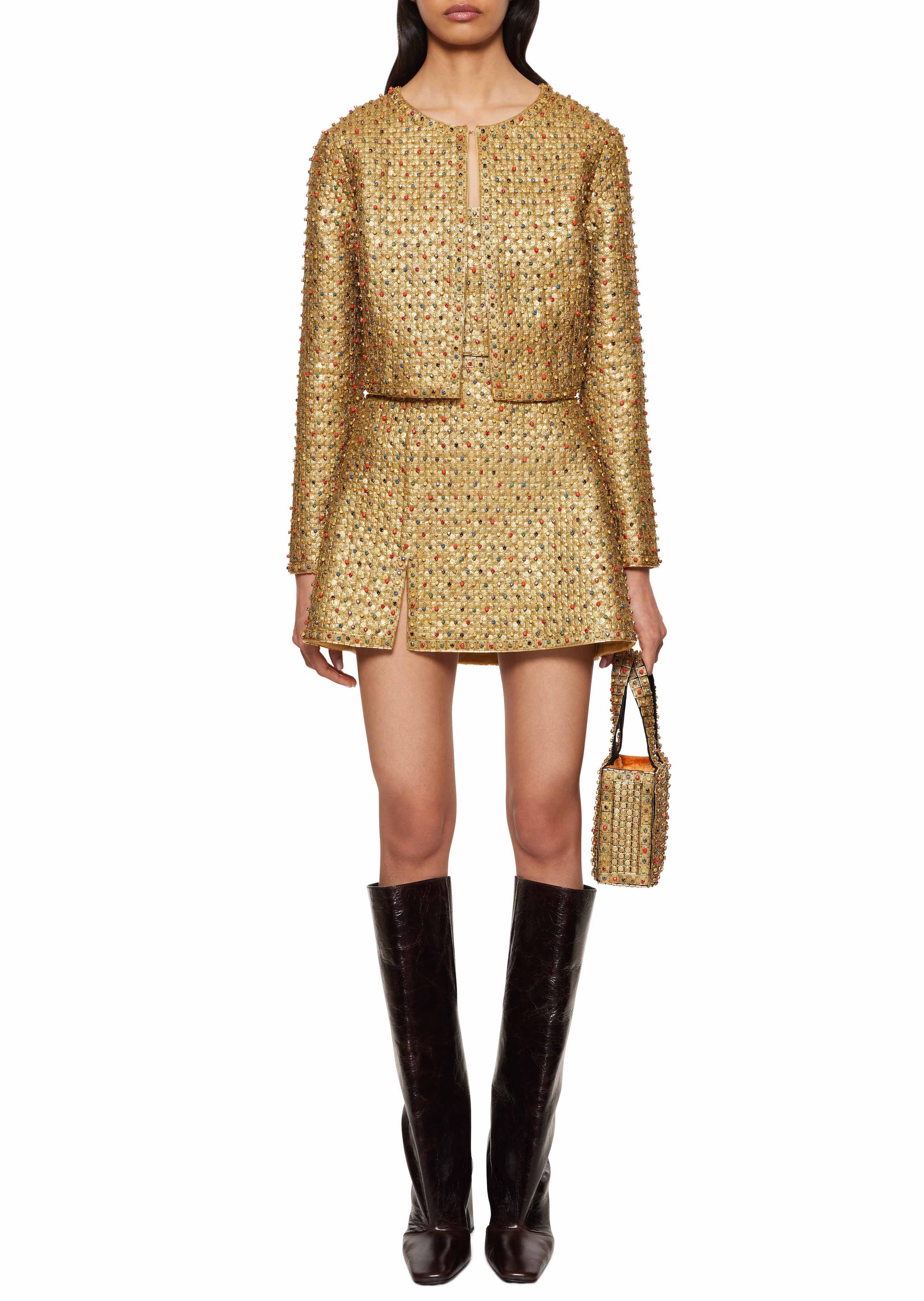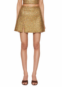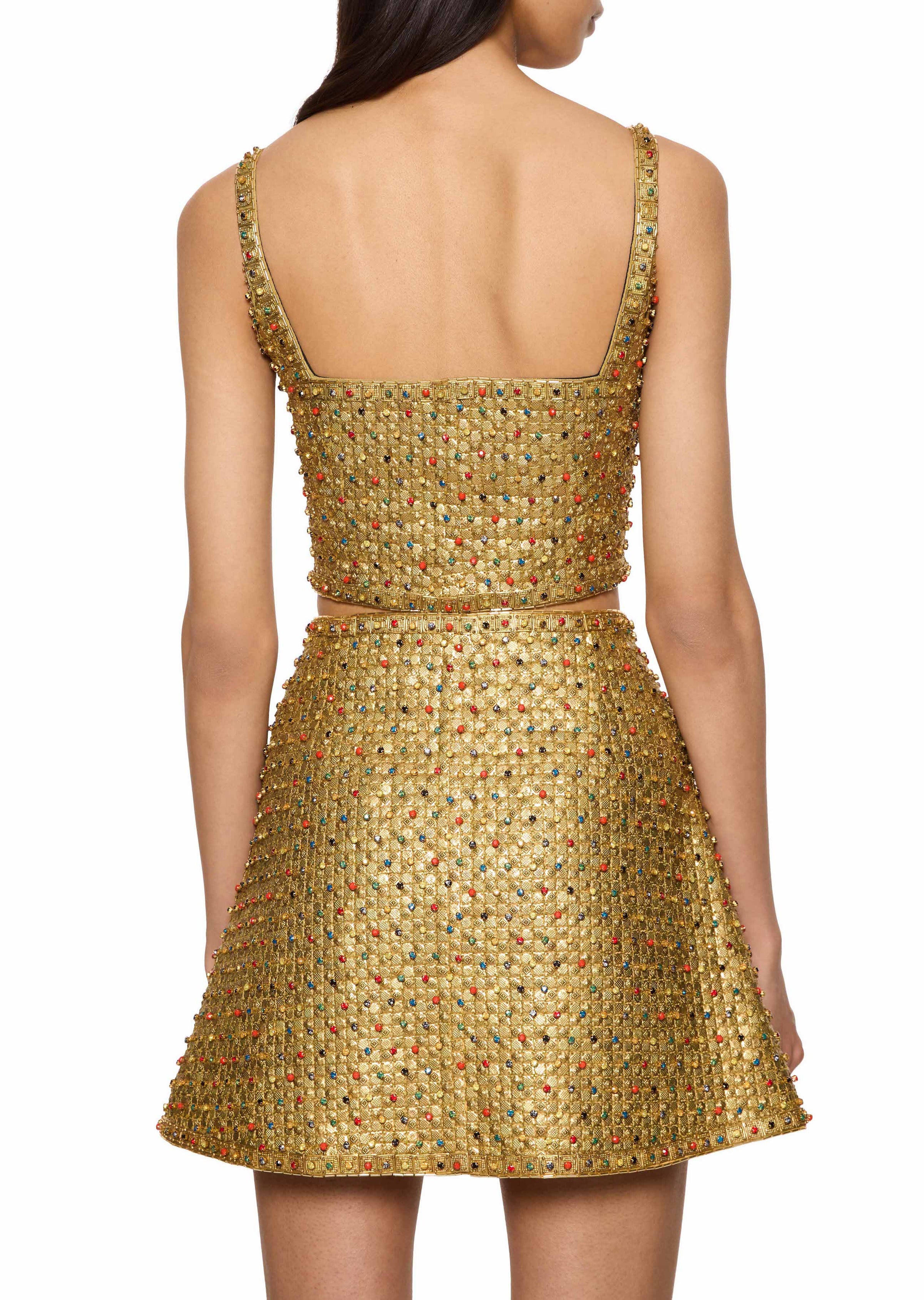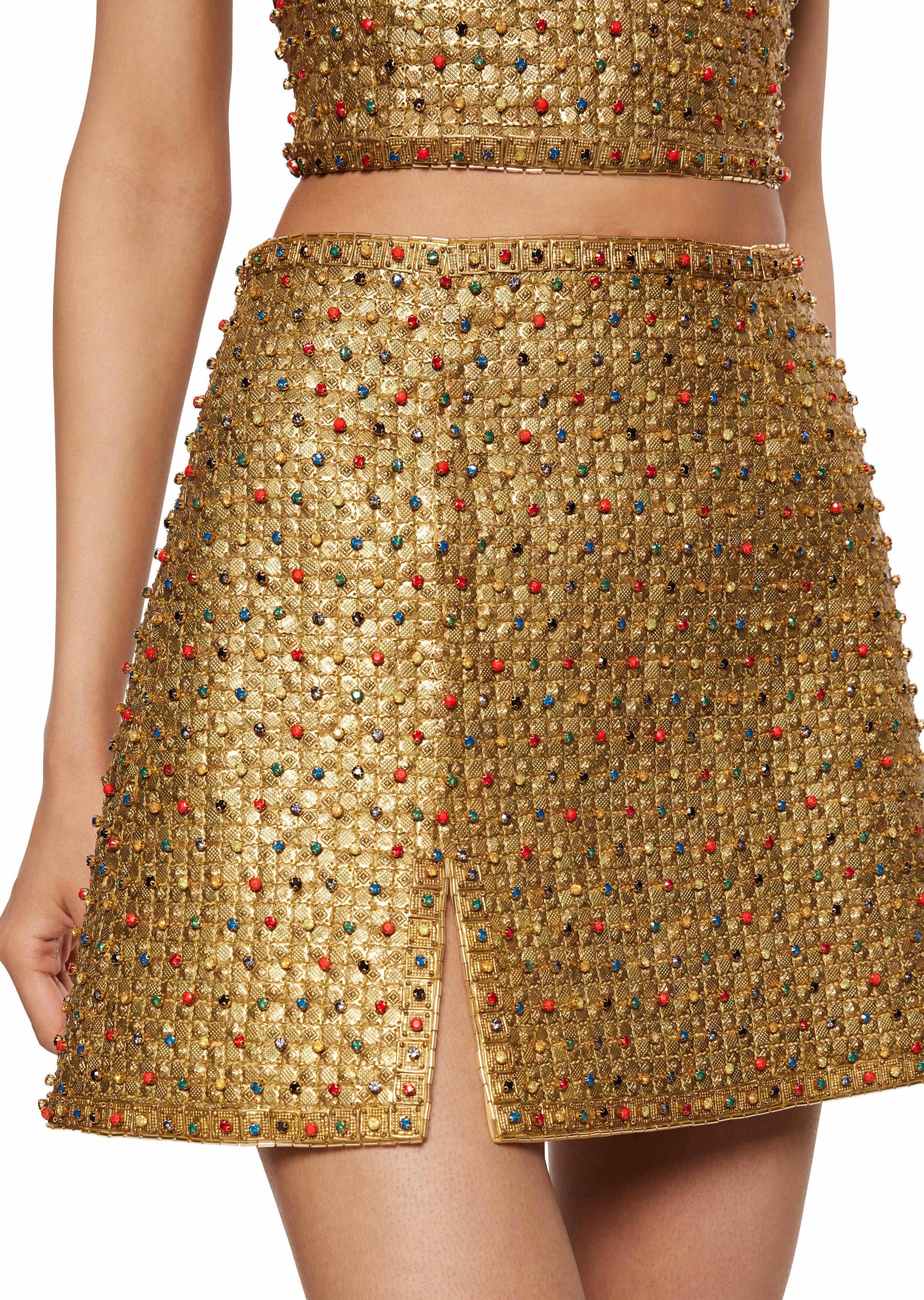 Discover the Achilles high waisted mini skirt in Aurous, featuring a handmade metal mosaic base adorned with hand-embroidered coloured rhinestones for a truly striking effect.