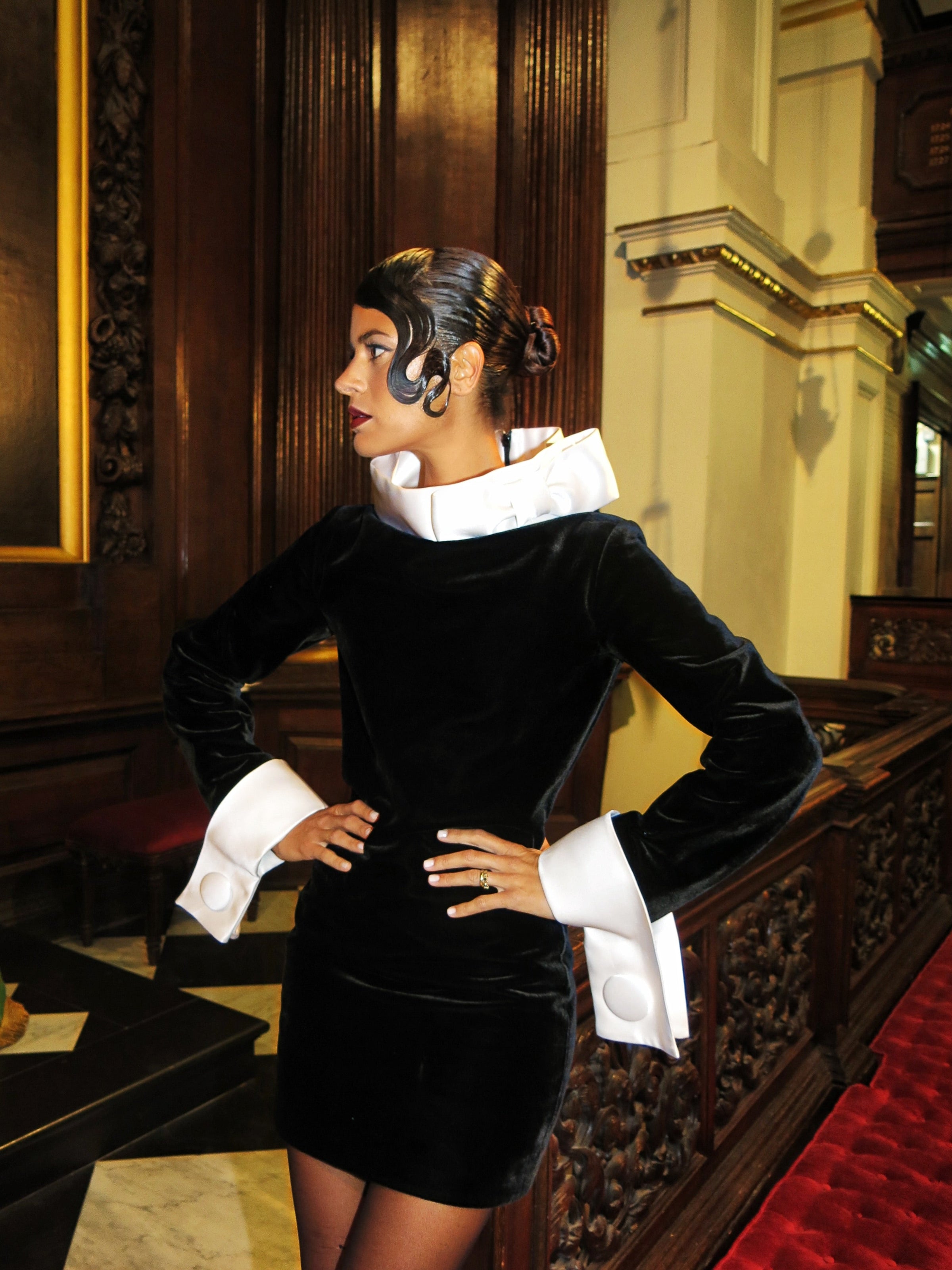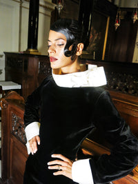 Crafted with meticulous attention to design, the dress features a standout white collar and cuffs. The bold oversized collar adds a bold and confident element to the neckline. Similarly, the exaggerated cuffs are designed to make a dramatic silhouette.The dress gives avant-garde flair for any party or event!