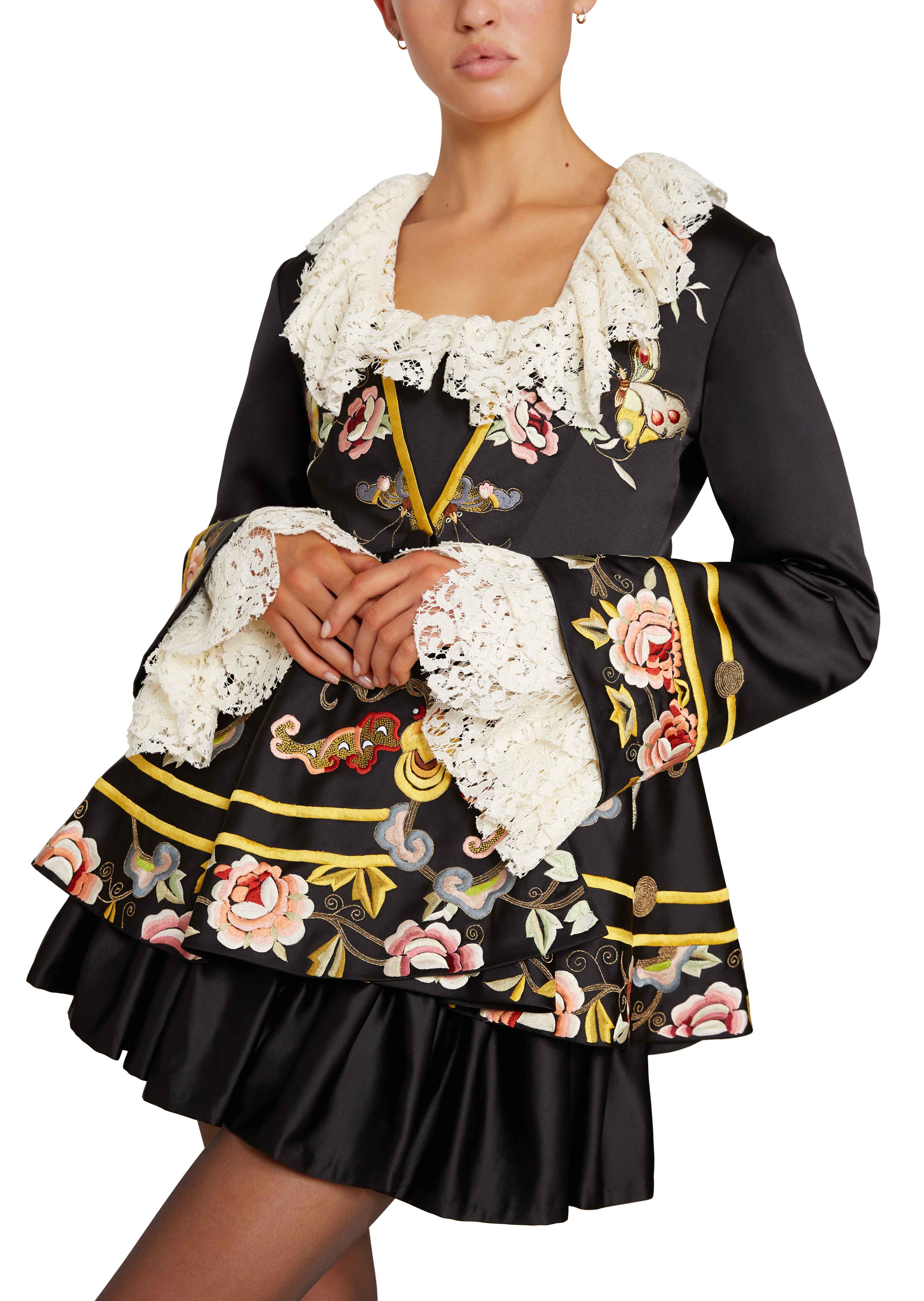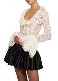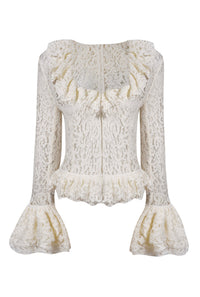 The Dahlia Lace Shirt is inspired by Victorian fashion with a ruffle neckline and bell ruffled sleeves. It's been crafted from delicate lace featuring a floral motif and a square neckline that frames the one's collarbone beautifully. The ruffled bell sleeves bring a playful and vintage-inspired element to the design.