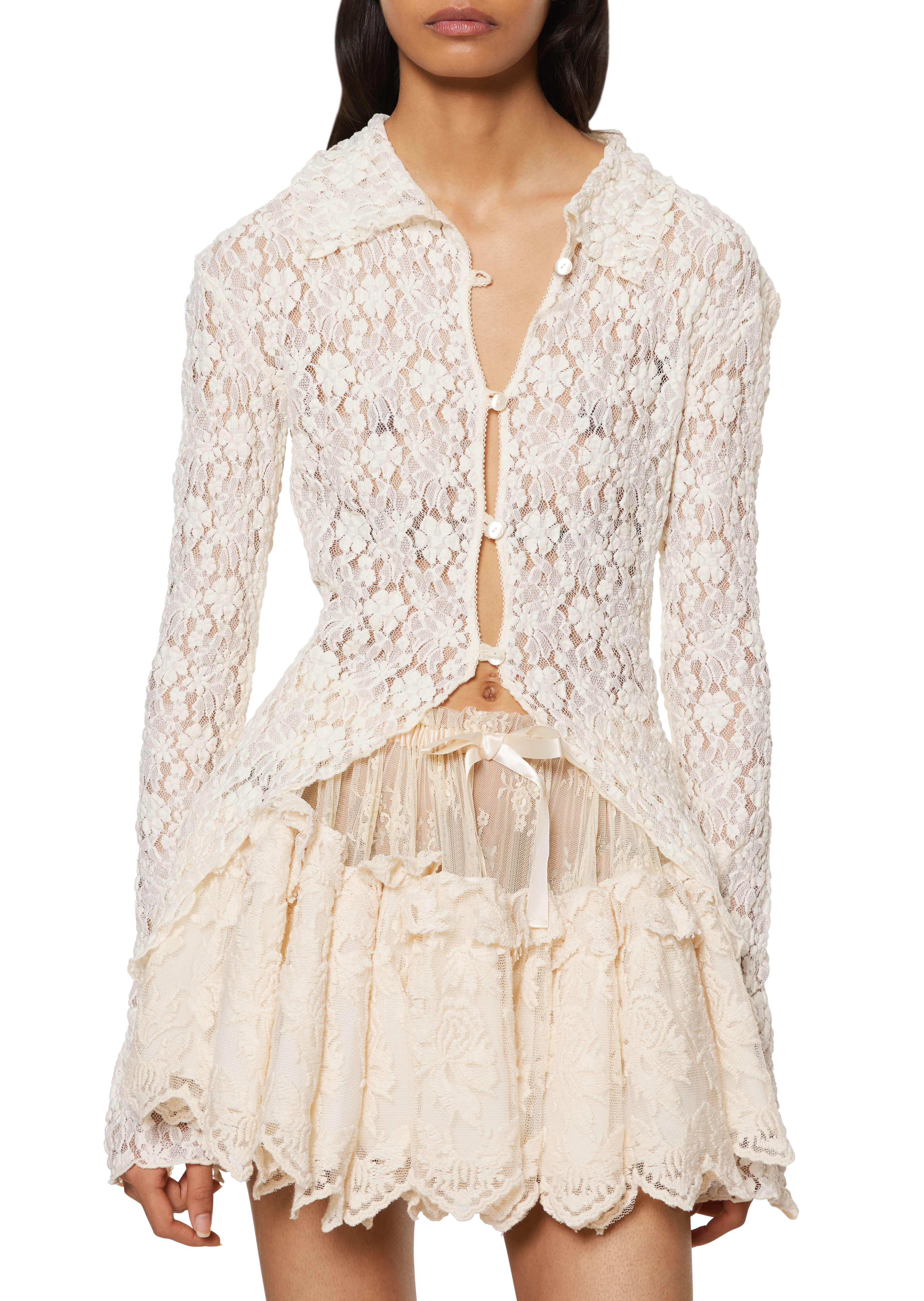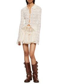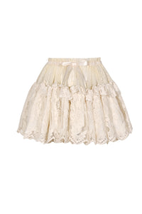 This voluminous and playful tutu skirt is a dreamy blend of delicate lace and soft textures, perfect for adding a touch of vintage-inspired romance to your wardrobe. The intricate lacework features floral motifs with a sheer panel to offer a subtle peek of skin, the satin ribbon drawstring cinches at the waist for a feminine finish.