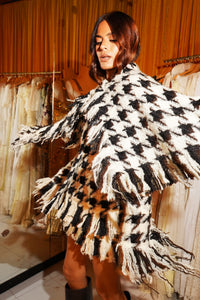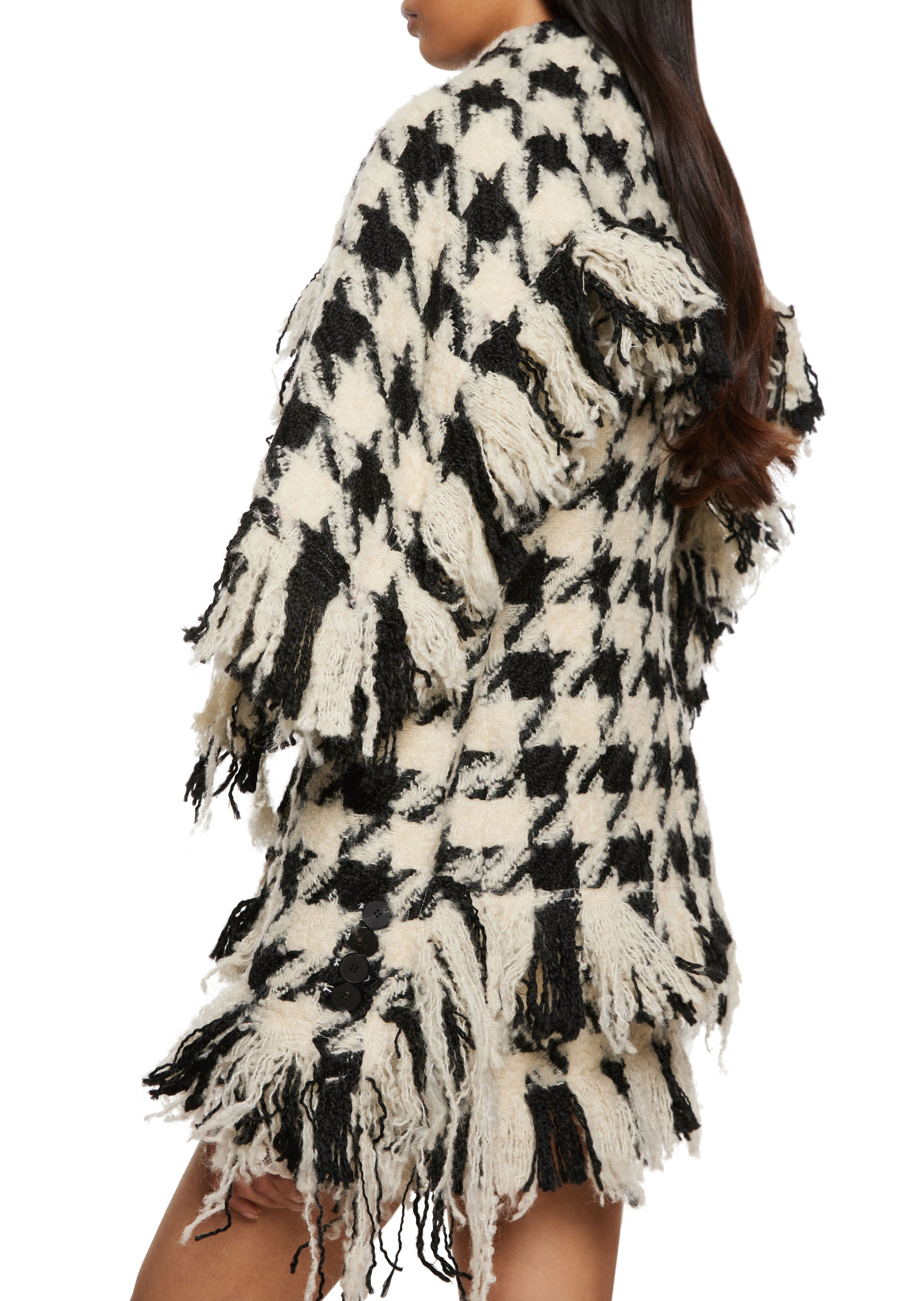 As seen on the catwalk at London Fashion Week this caped coat creates an exaggerated silhouette with an oversized houndstooth print and frayed tassel edges.