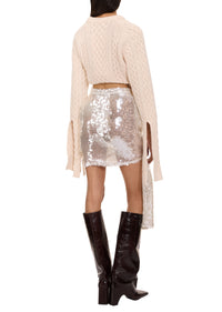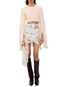 Coperni’s Fall 2024 collection draws inspiration from science fiction, alluding to space exploration and alien lifeforms. Crafted from super sheer fabric and covered in light-catching sequins for a starburst effect, this skirt has fluid draping and a looped, tied in fabric knot to one side which flows into a long train that sways as you move.