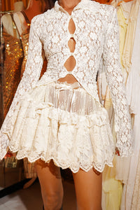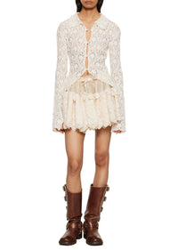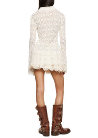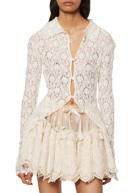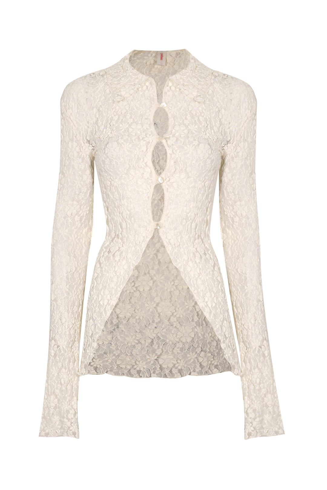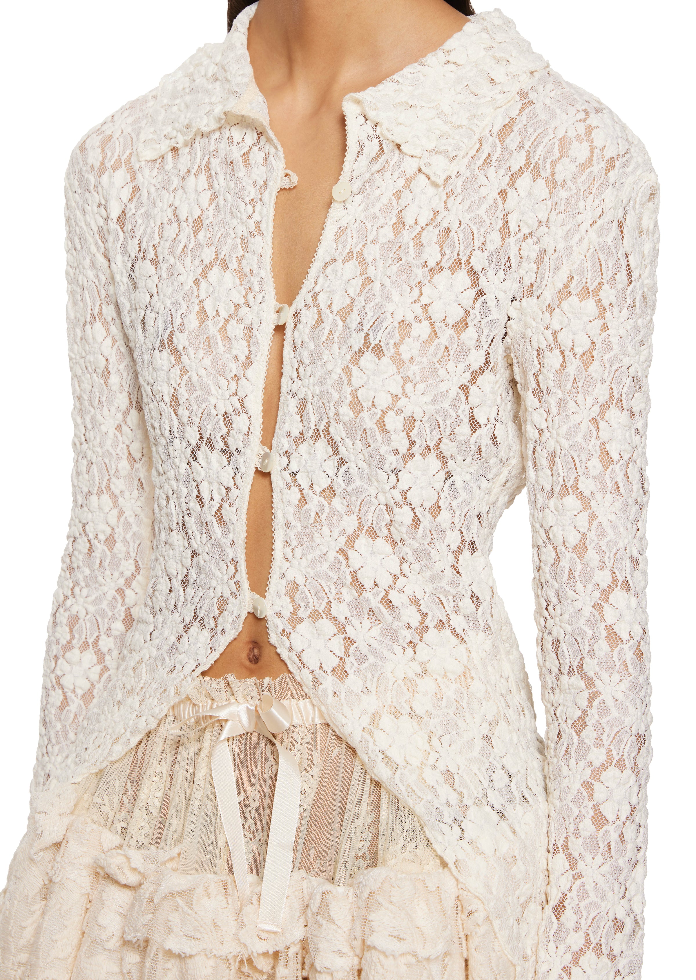 This delicate, sheer stretch blouse with a soft collar, features intricate floral lace detailing throughout and button closures.