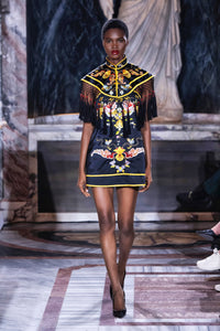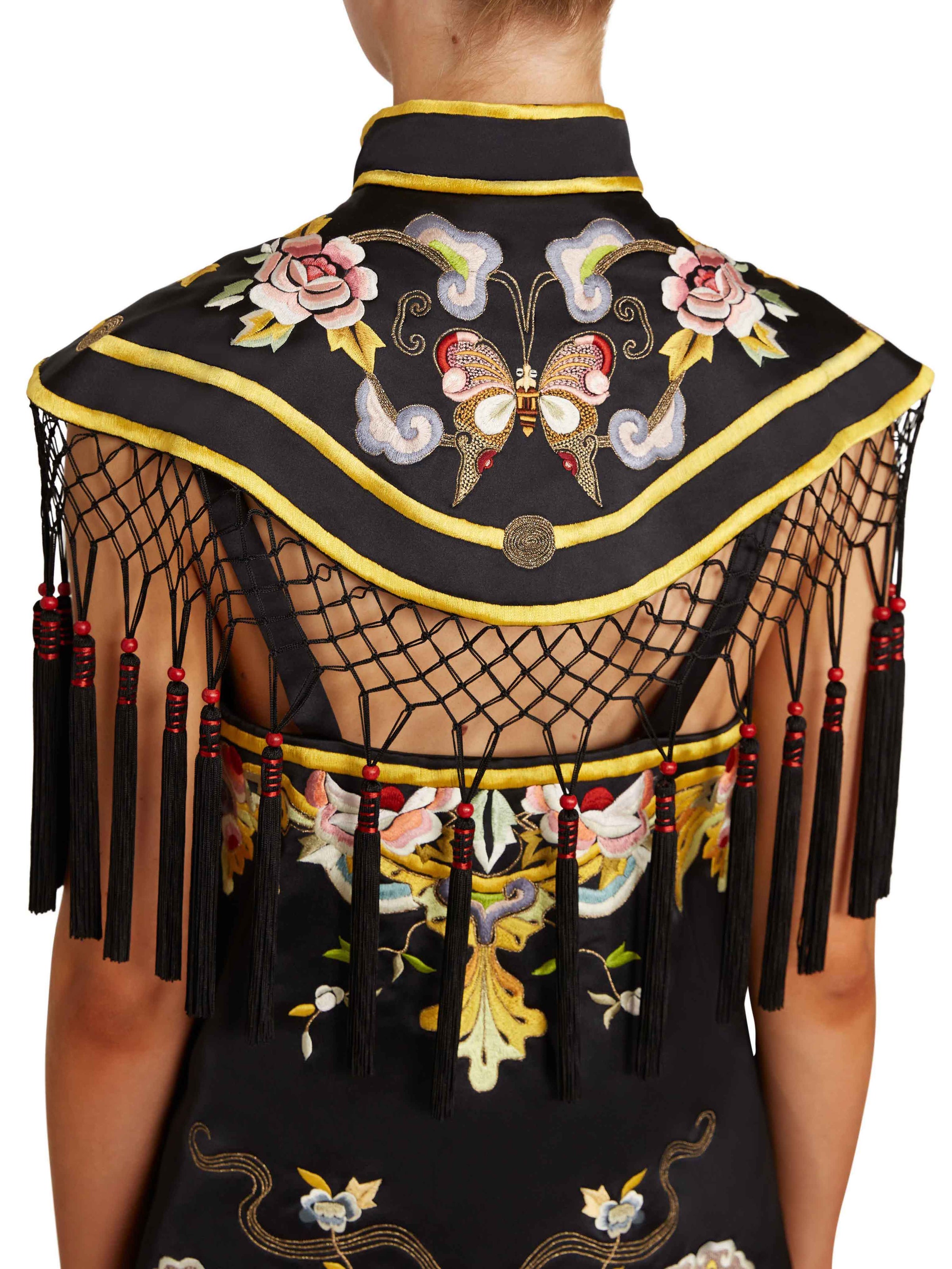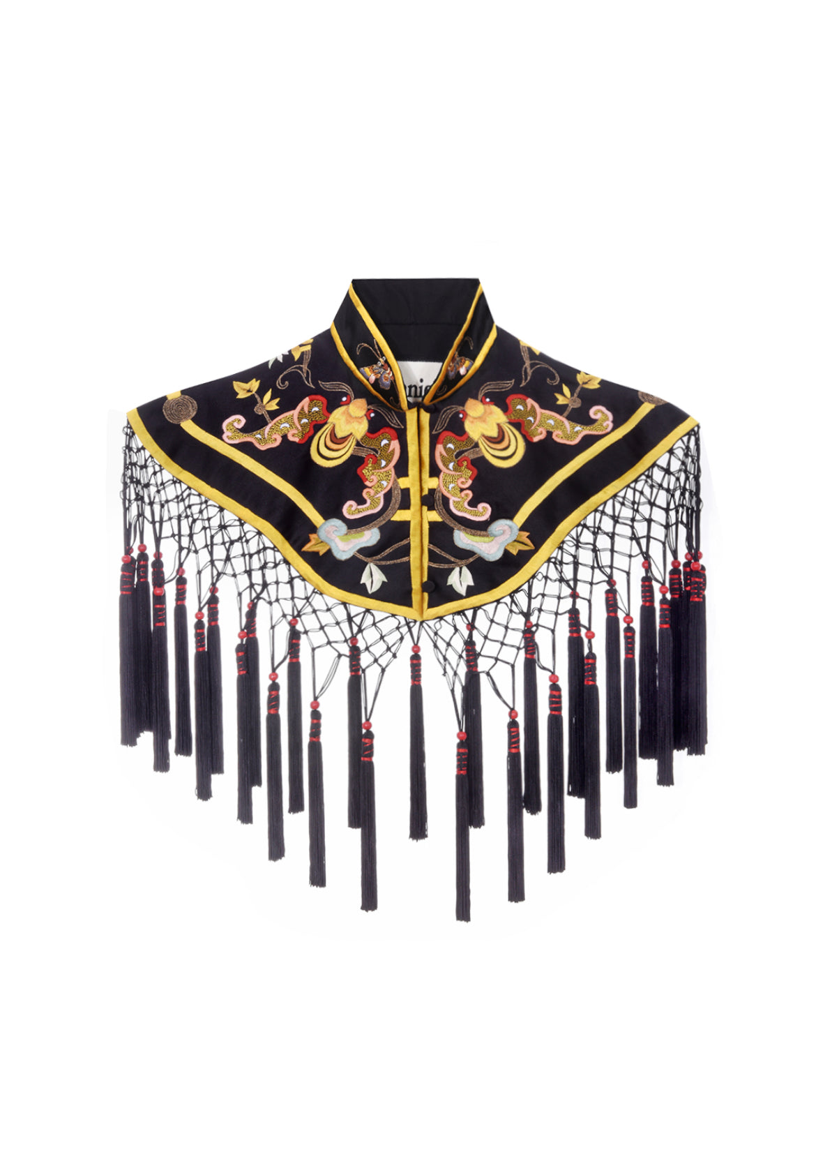 Elegantly to match its complex embroidery is its black fringed tassels lining the bottom of the cape. This iconic piece can be styled many ways!