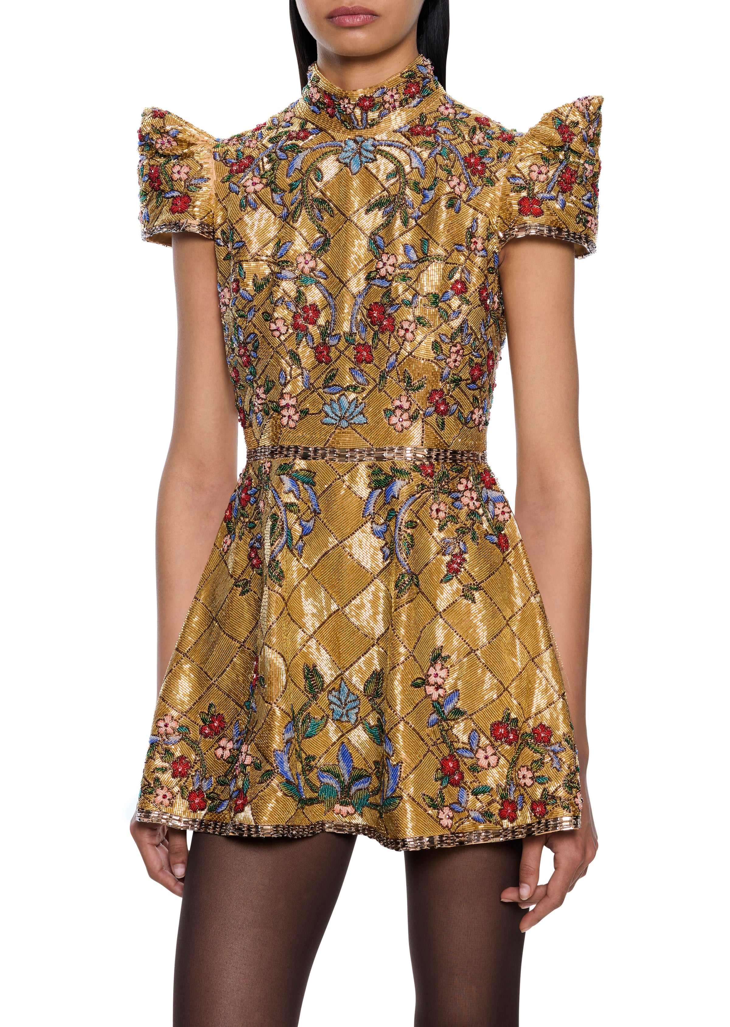 Inspired by the intricate beauty of Victorian stained glass windows, the Mercer mini dress shimmers on a gold mosaic-tiled beaded background. The delicate floral motifs are brought to life through shaded hand beadwork and the cinched waistline accentuates its sculptural silhouette with a sparkly smoky rhinestone border.