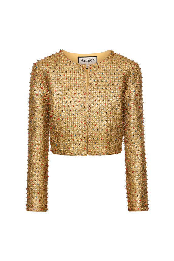 Annie has infused a new metalwork technique into Clio’s signature silhouettes, merging intricate hand-stitched metal details from Annie's own collection with playful, colourful beadwork.
