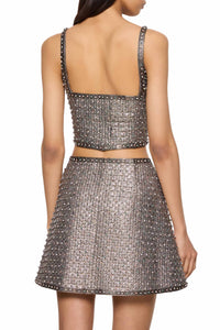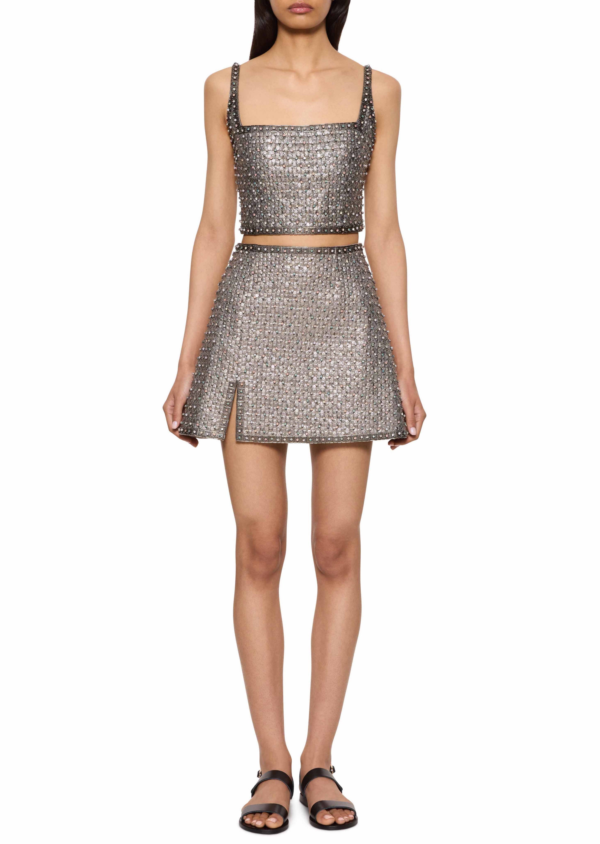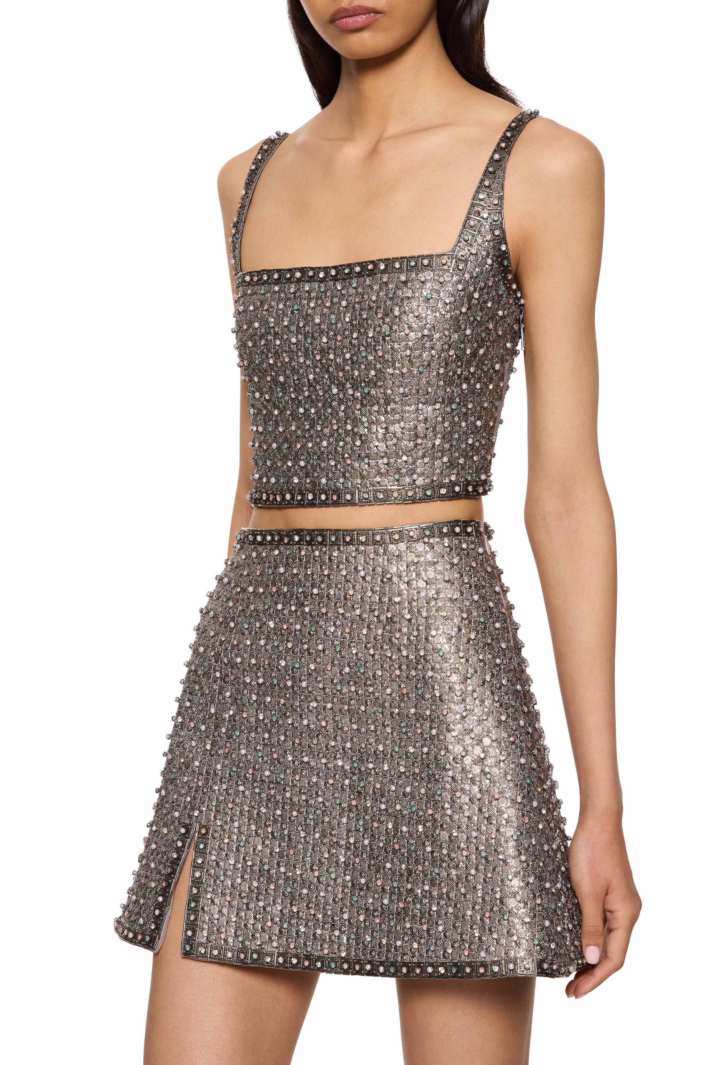 Discover the Achilles Cropped Top in Mercury, featuring a handmade metal mosaic base adorned with hand-embroidered coloured rhinestones for a truly striking effect.