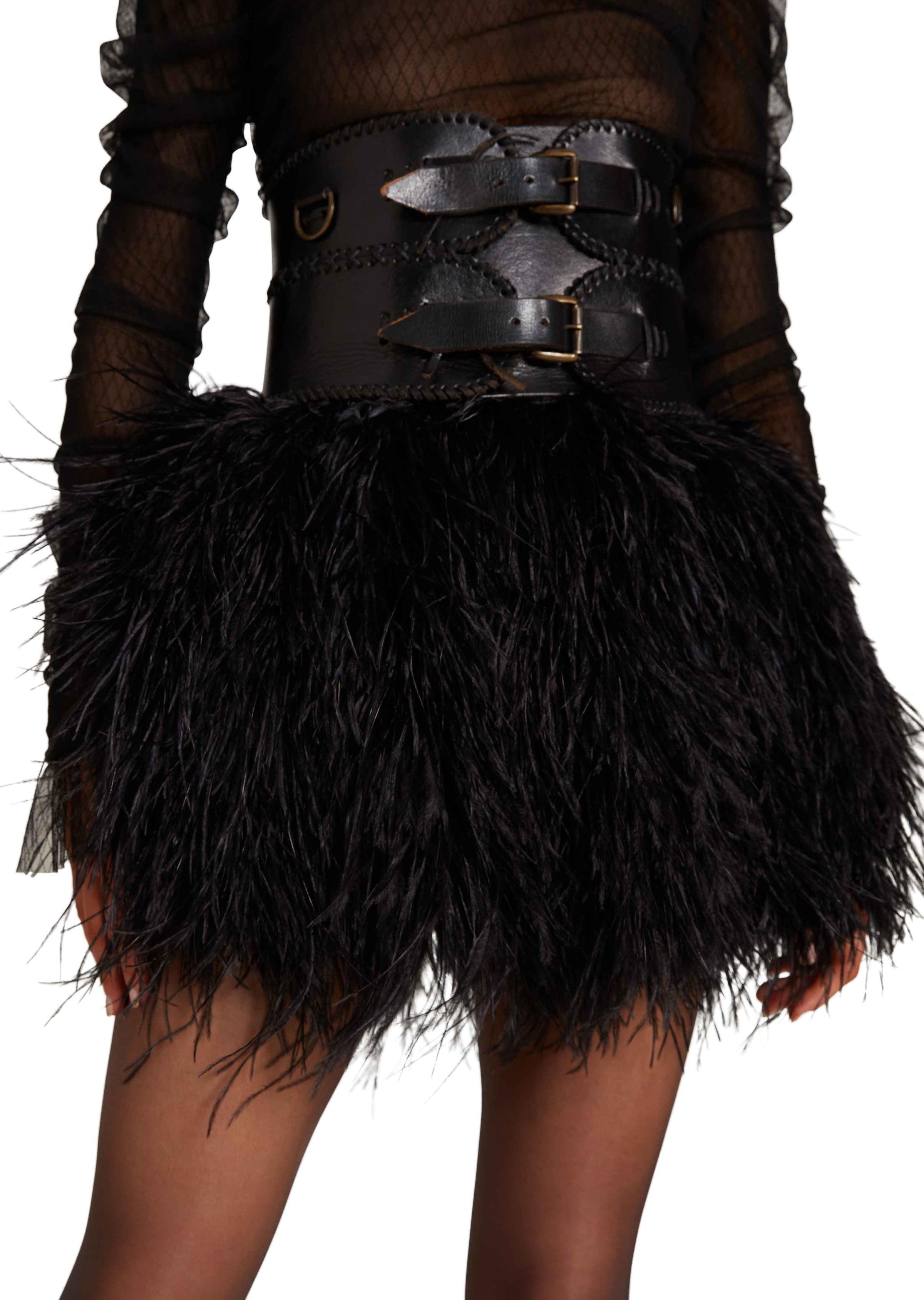 The Raven Skirt come in a full miniskirt made from luxurious ostrich feathers and features a voluminous, feminine silhouette. Designed to be versatile, the Raven can be worn both as a skirt and a shawl.