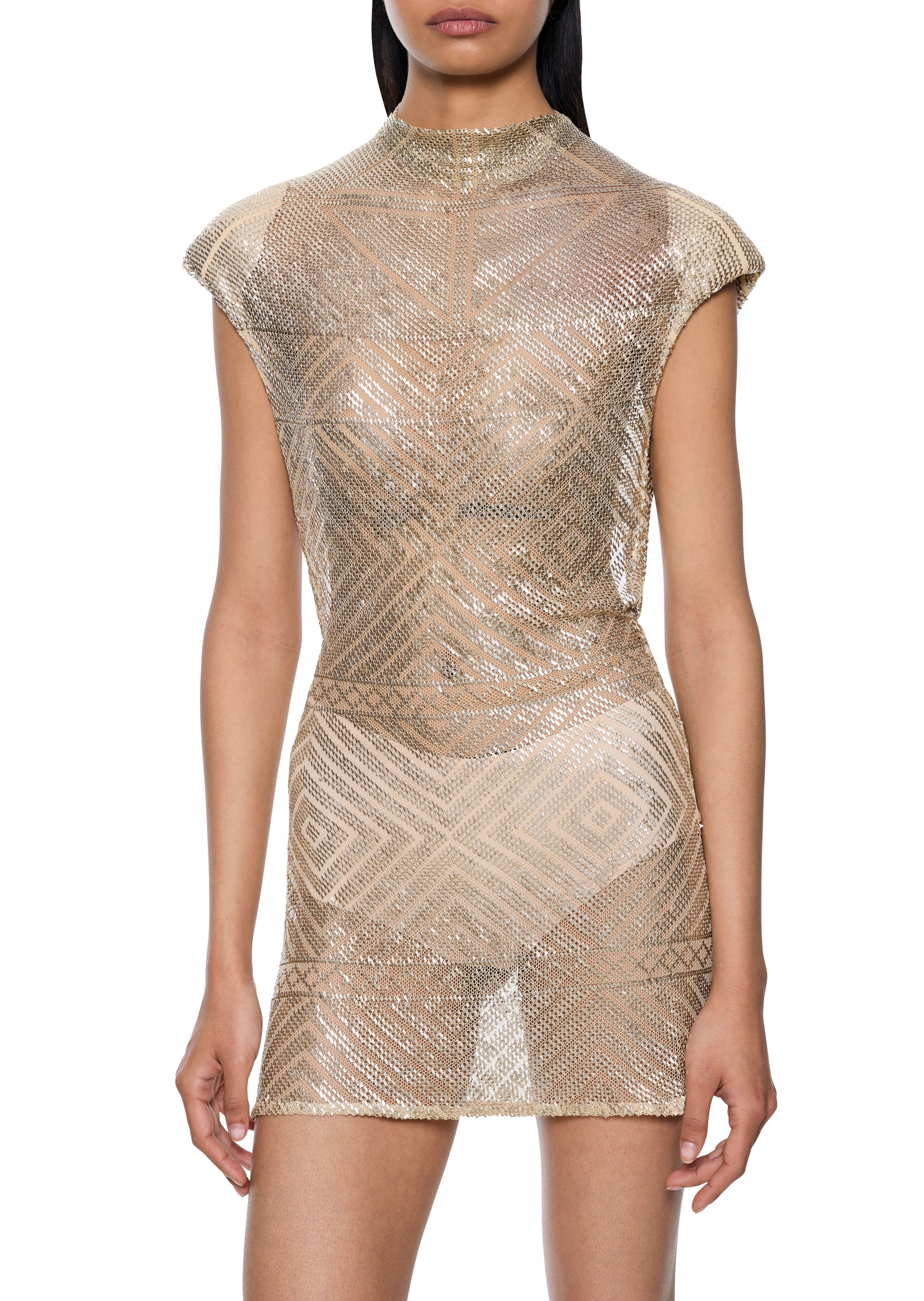Drawing inspiration from the grandeur of Ancient Egypt and Art Deco design, this shimmering mini dress features intricate geometric patterns that catch the light with every movement. The fabric, over 100 years old, originates from Cairo Egypt and is made by a very complex technique of hammering in silver to a handmade net base.