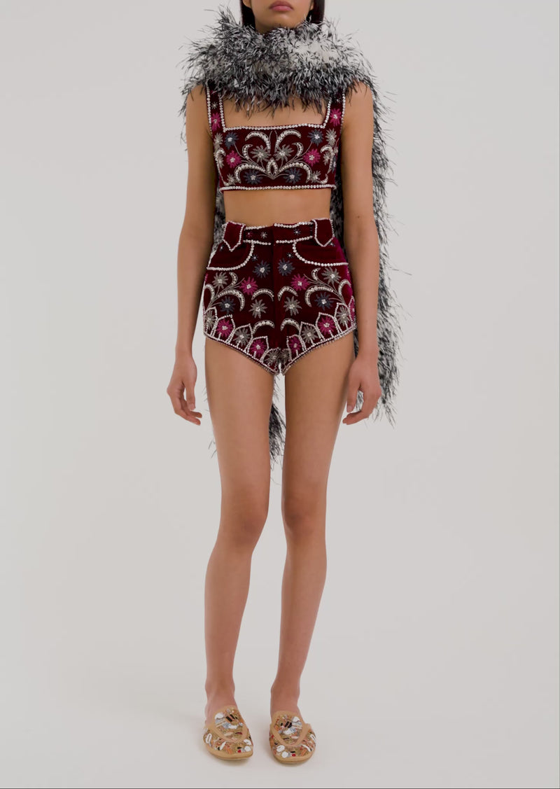 Inspired by the 1920s circus the Bam Bam top has a cropped and square-necked in deep burgundy velvet, adorned with hand-embellished crystals arranged in sweeping, ornate patterns that catch the light with every movement. Wear it as a set with the Bam Bam Shorts, or style alone on the dance floor, under the lights, anywhere you want to be the most magnetic person in the room.