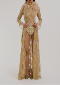 Densely embellished with a constellation of pearls and light-catching rhinestones and layered over intricate botanical embroidery. The result is a richly textured surface with soft shades of rose and sage that are rendered through detailed threadwork. Gold embroidery outlines and defines every leaf and petal, creating depth and a subtle metallic radiance.