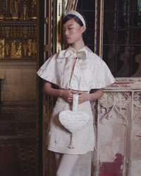Throughout the cape you'll find hand beaded ivory doves embroidered with swirling hearts and cloud motifs. Each cape is 100% hand beaded and handmade, taking up to 6 weeks to make.