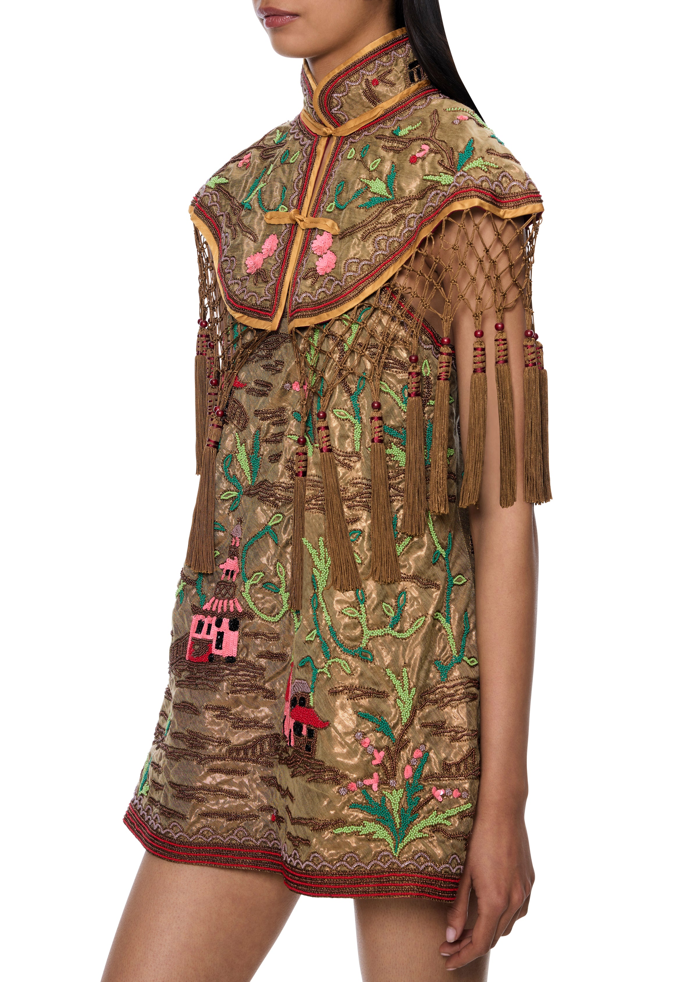 Annie’s "Etta” cape calls to mind 1920’s hand embroidery techniques rarely seen today. It's reimagined in metallic gold and woven lurex dead stock fabrics. The intricate detailing and hand-beaded process of the Etta Cape lends a classical eye-catching motif. Lined with gold and red beads as waves of green branches and hills dances throughout with vibrant pink sequin temple standing out.
